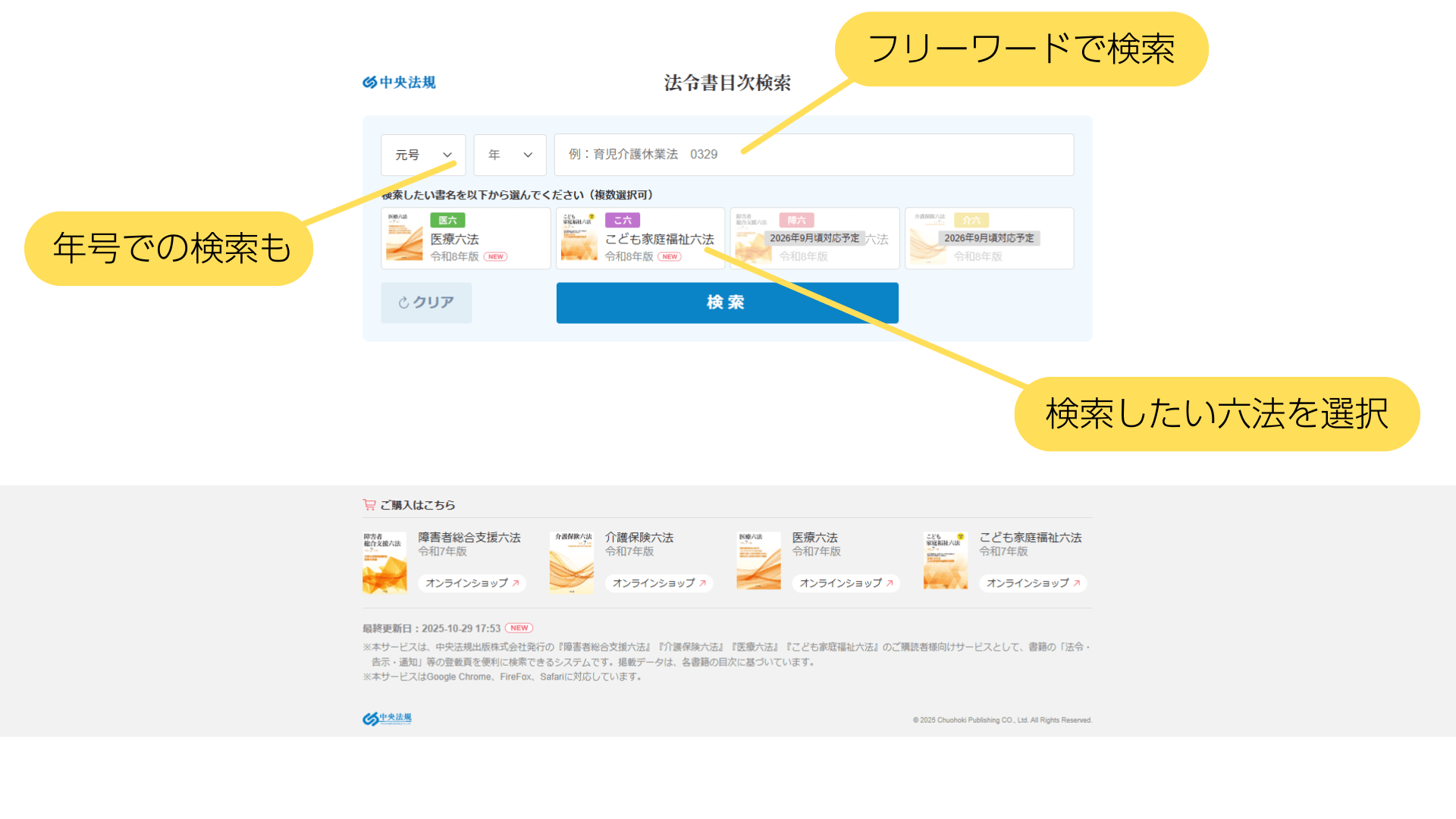 「法令書目次検索」は、中央法規出版が提供する無料のウェブサービスです。年号、フリーワードから、知りたい法令がどの『六法』の何ページに載っているかを調べることができます。