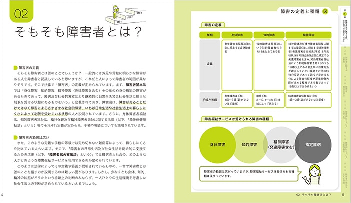 障害者をとりまく問題から、障害者総合支援法や障害福祉サービス、その他関連制度の知識をわかりやすく解説。豊富な図とイラストで視覚的に理解できる。障害福祉サービスの従事者や新人職員、ケアマネ等の相談援助職など、障害者支援にかかわるあらゆる方におすすめの入門書。