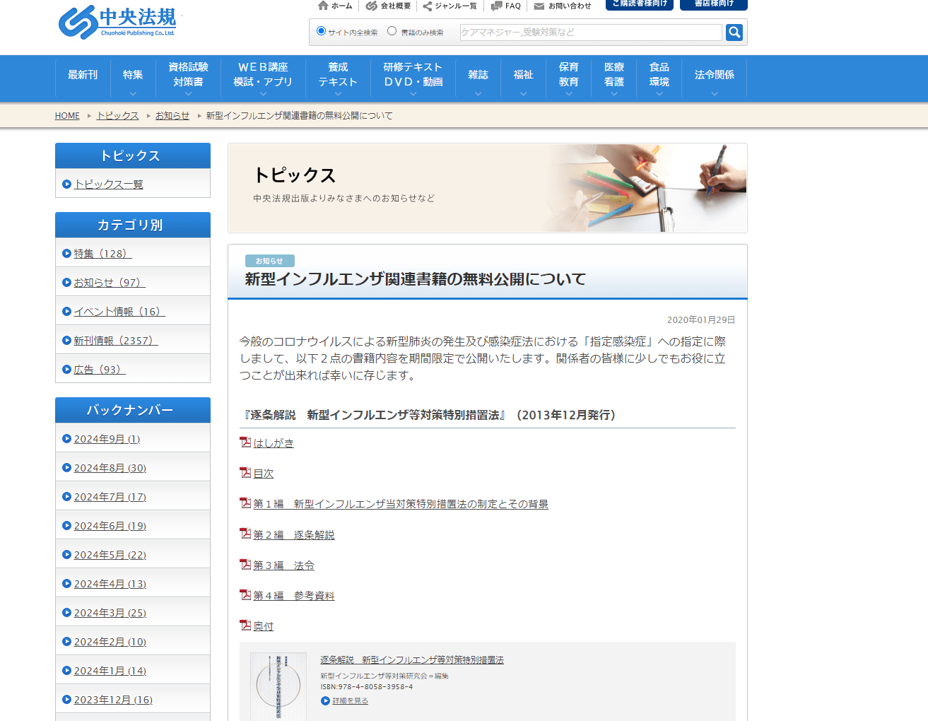 新型コロナウイルスが流行し始めた2020年、「特措法の逐条解説(2013年刊行)を読みたい」というたくさんの要望をいただき、弊社のホームページにて、期間限定で全文無料公開を行いました(現在は公開を終了しています)。